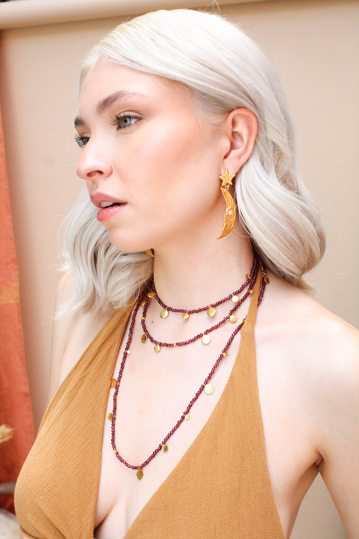 Aretes con luna alargada y estrella en la parte superior, ambos con textura orgánica y perla incrustada como ojo. La luna simboliza intuición y protección, la estrella inspiración y guía, y la perla armonía. Perfectos para un look bohemio y simbólico. Material: Chapa de oro de 24k Piedras: perla natural Medida: 6.5 cm