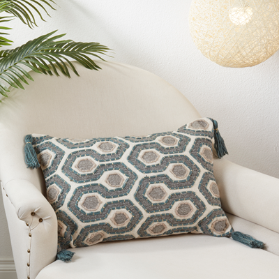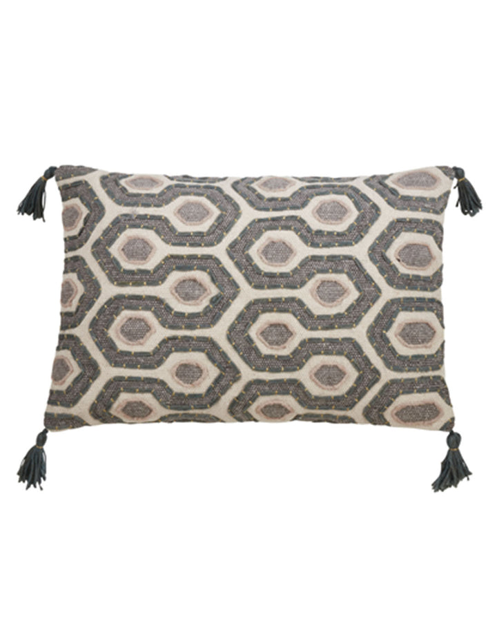 Este cojín se distingue por patrón hexagonal, sus texturas en relieve y sus elegantes borlas en las esquinas, que le añaden un toque artesanal y decorativo.