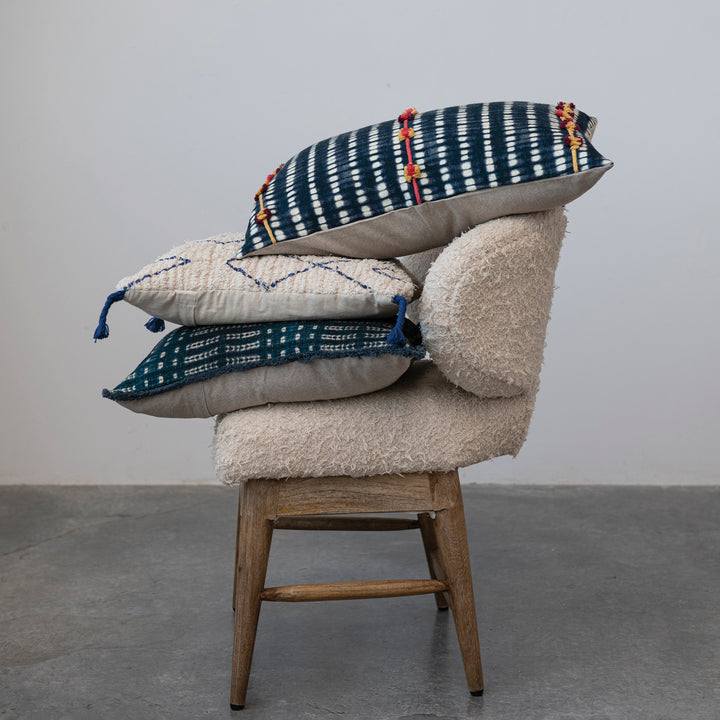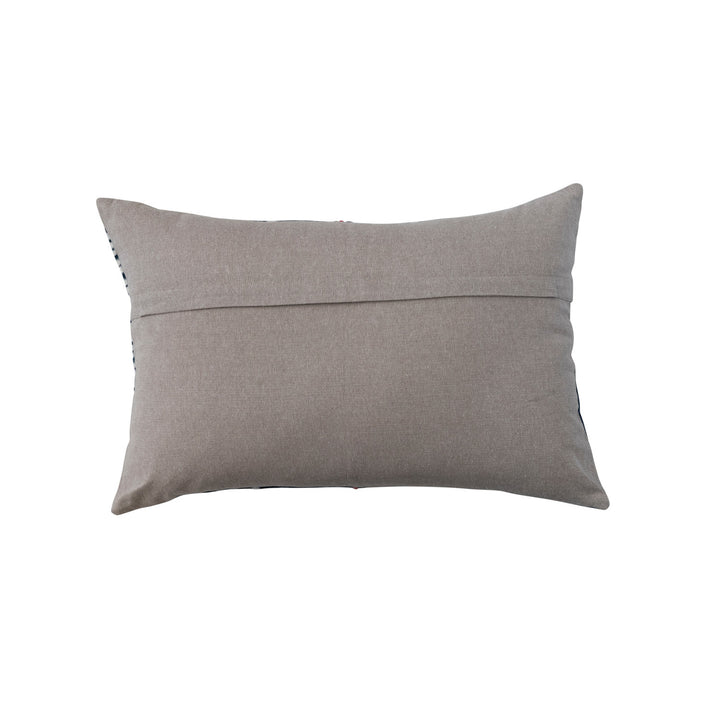 Este ecléctico cojín lumbar de algodón flameado presenta un divertido estampado tie-dye con detalles bordados intrincados.