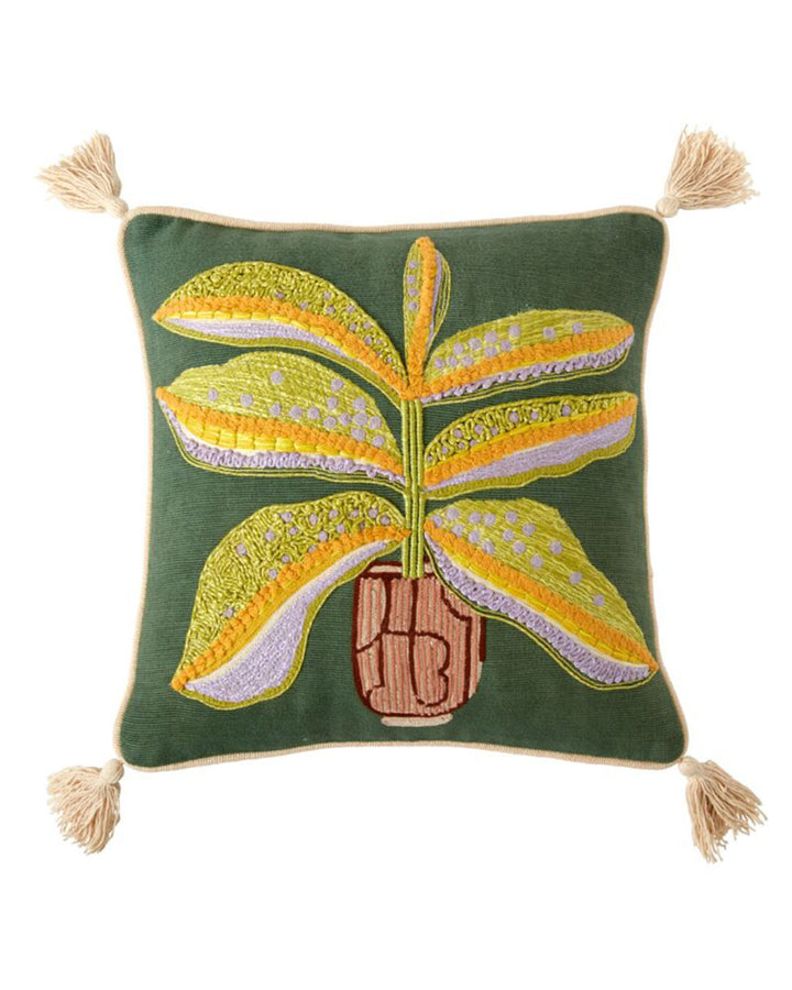 Cojin con diversas técnicas de bordado y divertidas combinaciones de verde, amarillo y lavanda, crean una atmósfera artística diseñada por Jessica Hiemstra.