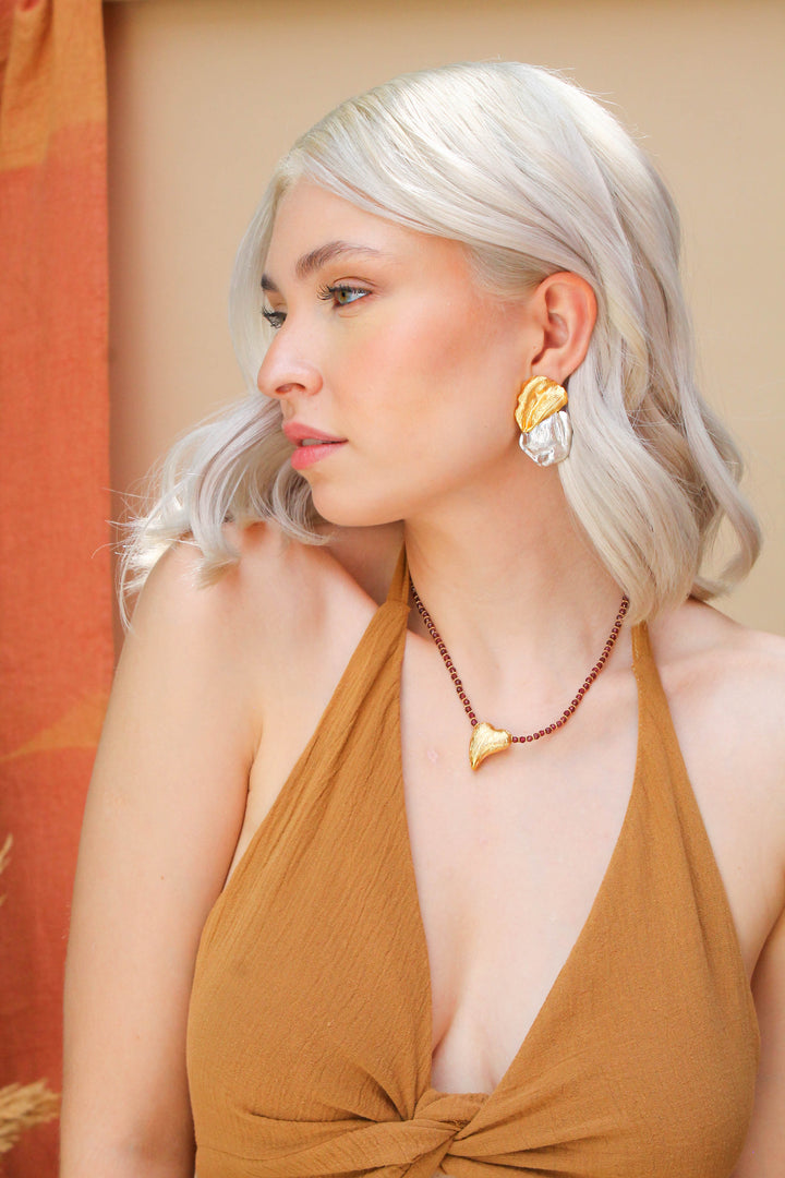 Collar delicado con granate natural y dije orgánico en forma de corazón con textura, simbolizando pasión, protección y amor propio. Perfecto para layering o para resaltar un look bohemio sofisticado. Material: Chapa de oro de 24k Piedras: granate Medida cadena: 38 cm + 7 cm extensión Dije: 3 cm
