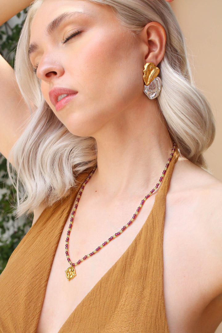 Collar delicado con piedras naturales amatista y aventurina, con dije en forma de medalla con textura orgánica y grabado de ojo al centro, símbolo de protección, intuición y claridad. Ideal para rituales, meditación o como accesorio diario lleno de significado. Material: Chapa de oro de 24k Piedras: amatista y aventurina Medida cadena: 54 cm + 8.5 cm extensión Dije: 3.5 cm
