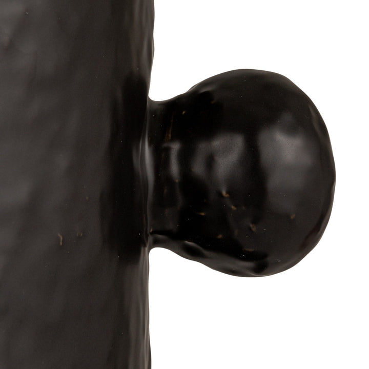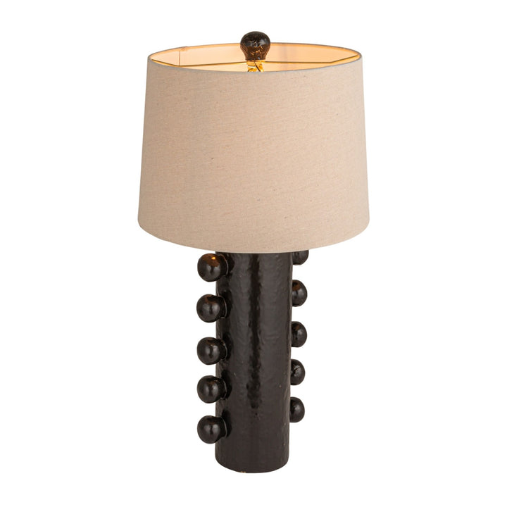 Aporta carácter y estilo a tus espacios con esta llamativa lámpara de mesa. Su base de cerámica negra esmaltada destaca por un diseño escultórico con detalles en relieve que evocan un estilo moderno y artístico. El contraste con su pantalla de lino en tono natural suaviza la pieza, equilibrando elegancia y audacia.