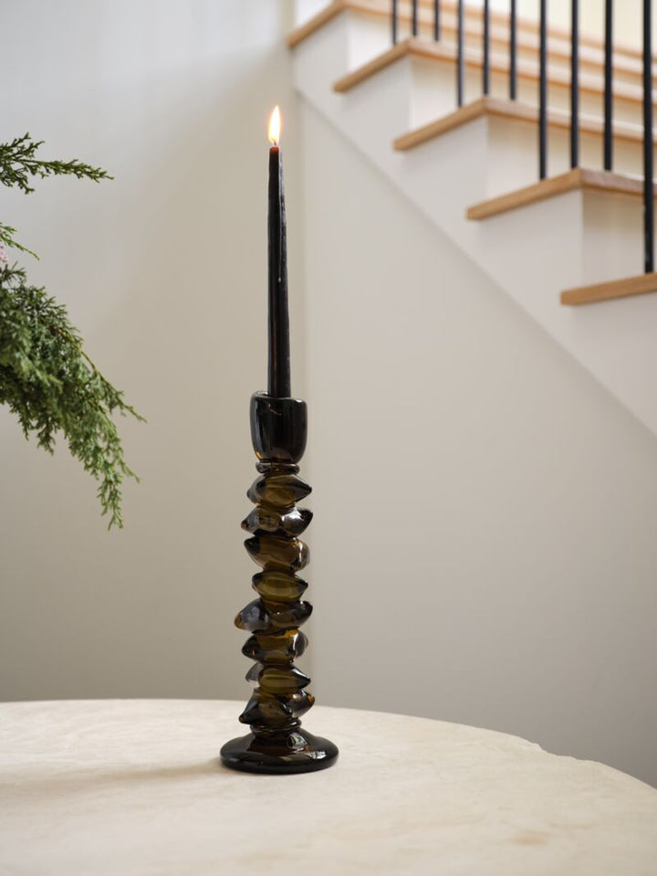 Con sus formas esculturales y su silueta orgánica y llamativa, el robusto candelabro de vidrio apilado es una obra de arte con carácter.